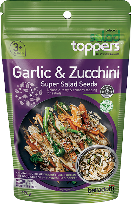 Dry roasted & garlic infused sunflower & sesame seeds, zucchini, onions, chia seeds, garlic & parsley flakes. A good source of magnesium and copper (to stay strong), with selenium (a proven enemy of cancer) and loaded with antioxidants